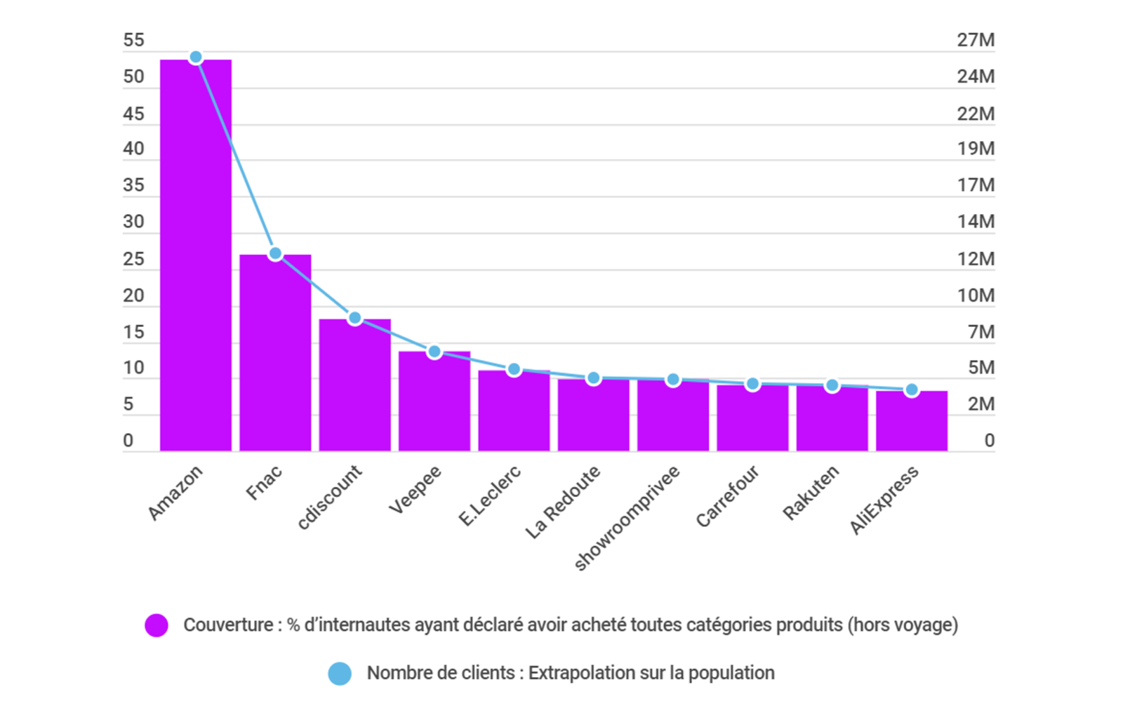 Le top 10 de la pénétration des sites marchands toutes catégories confondues en 2020 par la Fevad vient de paraître ! En tête du classement des sites marchands, toutes catégories confondues (hors voyages), figure sans grande surprise le géant américain Amazon (53,7%) suivi par le site de la Fnac (27,0%) et celui de Cdiscount (Groupe Casino) (18,2%). Notons que 70% de ce top 10 est composé de sites français, ce qui est une bonne nouvelle. Par ailleurs, AliExpress (Chinois), arrivé depuis peu en France, est déjà présent dans le top 10... Il y a de quoi s'inquiéter car le groupe Alibaba a de grande ambitions en matière d'E-commerce en France et en Europe.